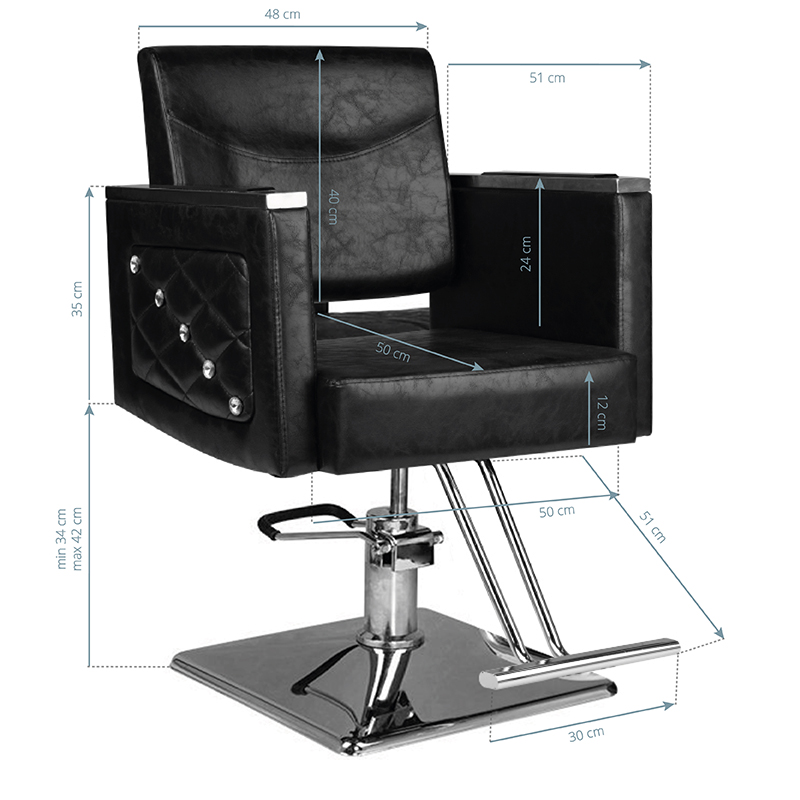 Moderna frizerska stolica jedinstvenog dizajna. Vrlo udobna i posebno profilirana kako bi klijentu omogućila udoban položaj tijekom zahvata. Podesiva u vertikalnoj ravnini i podesivi naslon za glavu. Vrlo stabilna i čvrsta. Eleganciju ove fotelje nadopunjuje kvadratna baza izrađena od najkvalitetnijeg INOX čelika