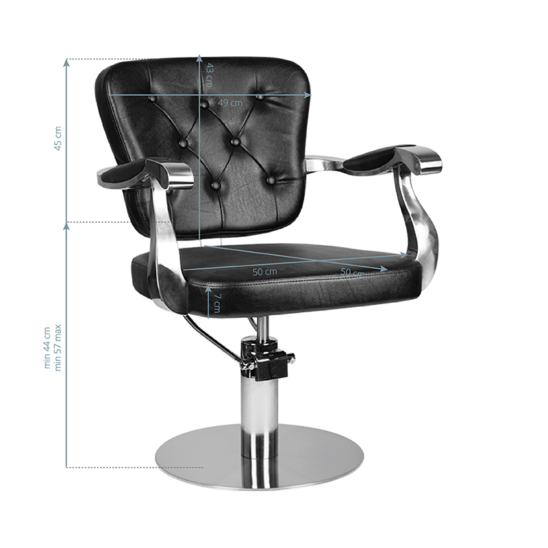 Moderna frizerska stolica jedinstvenog dizajna. Vrlo udobna i posebno profilirana kako bi klijentu omogućila udoban položaj tijekom zahvata. Podesiva u vertikalnoj ravnini. Vrlo stabilna i čvrsta. Eleganciju ove fotelje nadopunjuje okrugla baza izrađena od najkvalitetnijeg INOX čelika