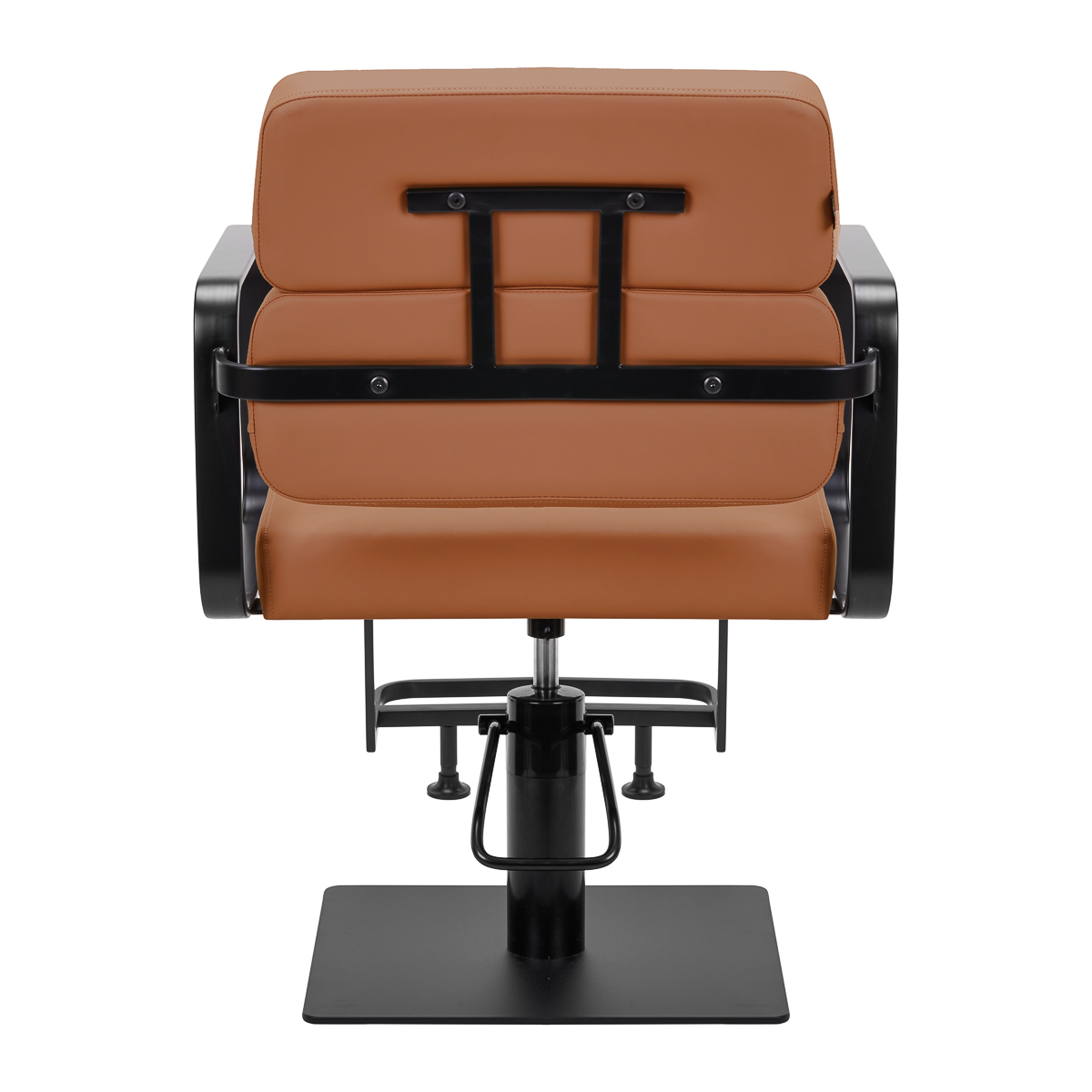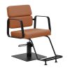 Funkcija potpune rotacije stolice čini rad frizera učinkovitijim i ugodnijim. Čvrsta, ravna baza kvadratnog oblika jamči stabilnost tijekom korištenja. Mat završna obrada glatke površine daje elementu elegantan izgled i olakšava čišćenje. Udobno sjedalo s ispunom od pjene osigurava visoku razinu udobnosti čak i tijekom dugotrajnih tretmana. Geometrijski oblikovani metalni nasloni za ruke omogućuju pravilan položaj ramena klijenta – sprječavaju spuštanje glave među ramena i pogrbljenost – što znatno olakšava izvođenje preciznih tretmana poput šišanja. Stilski oslonac za noge, posebno dizajniran za ovaj model, pruža stabilnu potporu za stopala korisnika.
