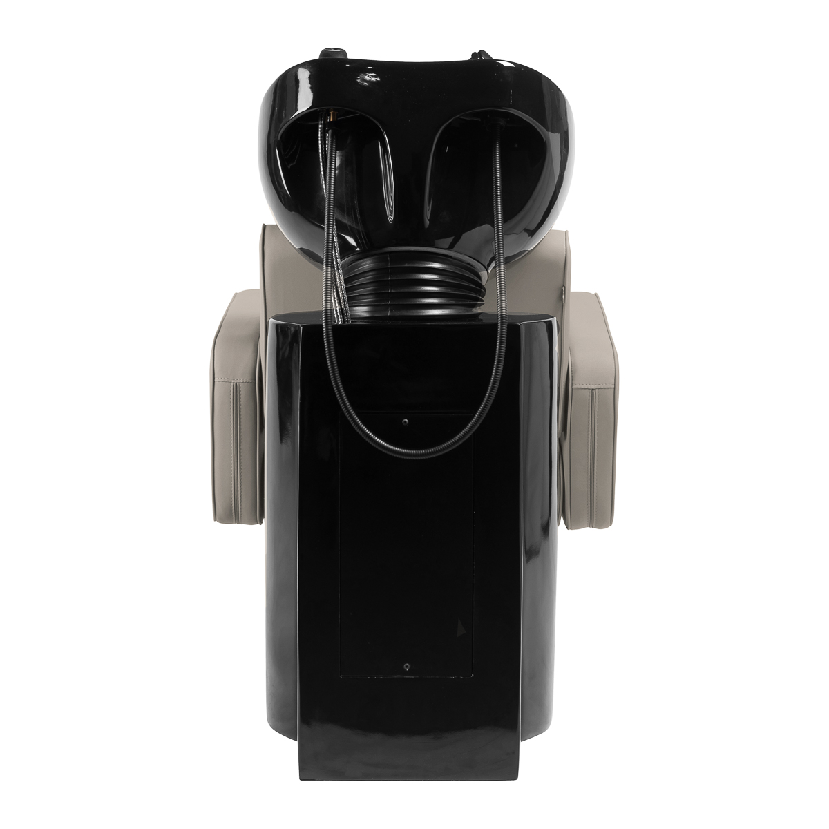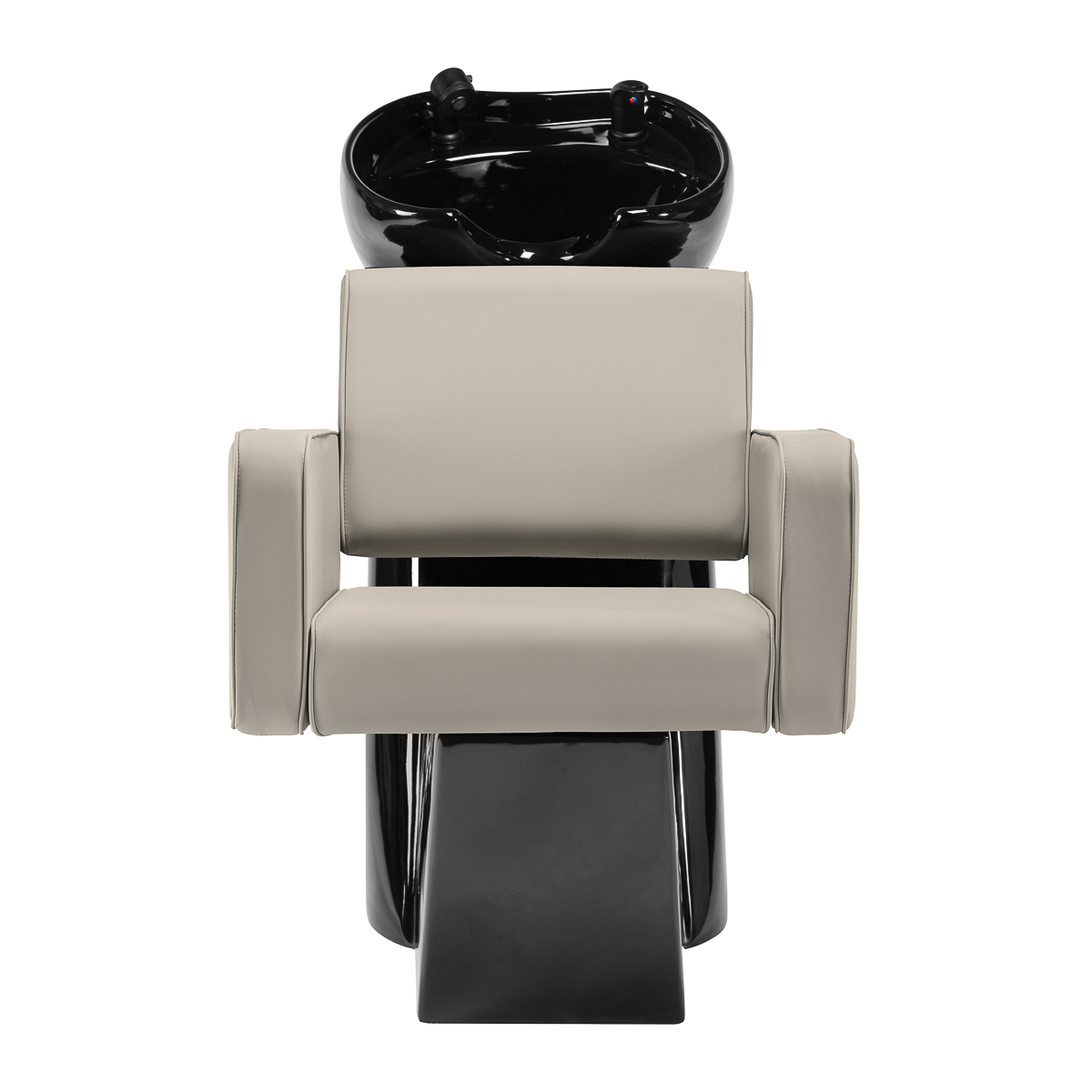 Duboka keramička posuda u crnoj boji sprječava prskanje vode i kozmetičkih proizvoda tijekom tretmana. Podesivi kut nagiba omogućuje precizno prilagođavanje položaja posude potrebama klijenta. Izrađena je od izdržljivog materijala otpornog na ogrebotine, promjenu boje i kemikalije, a glatka površina olakšava održavanje čistoće. Ergonomski oblikovan oslonac za vrat i crni plastični umetak osiguravaju udobnost i uklanjaju osjećaj hladnoće pri dodiru s keramikom.