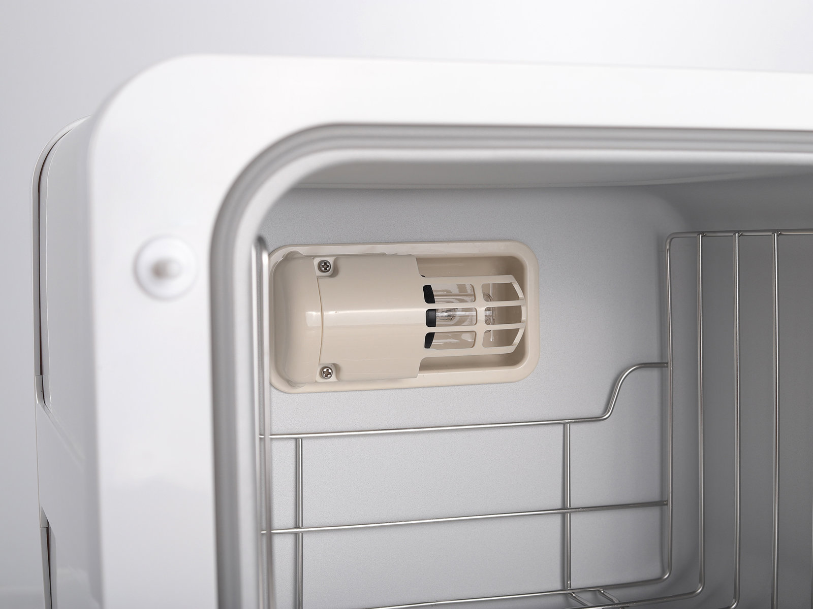 Profesionalni grijač za male ručnike i masažne pečate, opremljen UV lampom za sterilizaciju i integriranim spremnikom za kondenzat. Savršeno će se uklopiti u masažne studije, kozmetičke salone i SPA centre. Male dimenzije i minimalističko bijelo kućište sa zaobljenim linijama odgovarat će svakom prostoru, čak i vrlo malom.