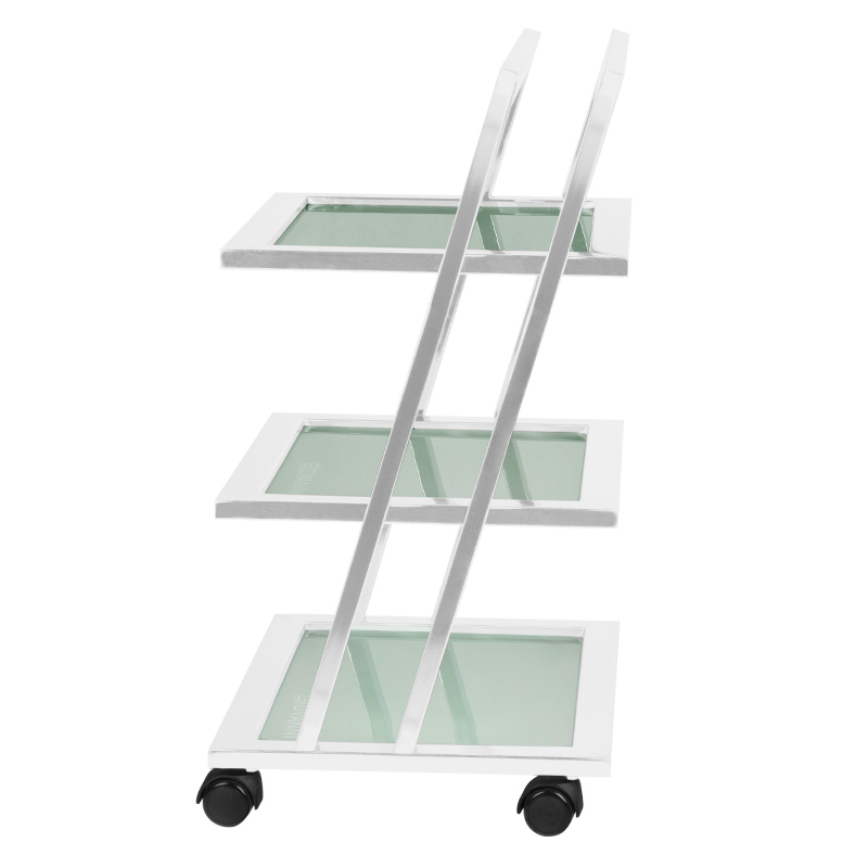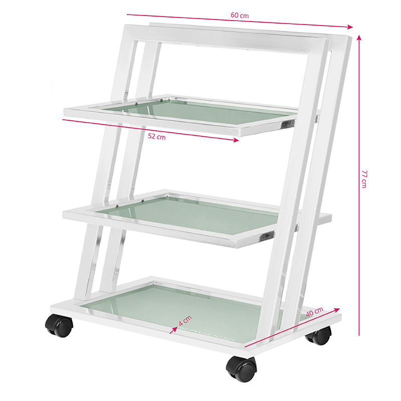 Kozmetička kolica za odlaganje izrađena od metala, sa staklenim policama. Mobilna, idealna za kozmetičke i spa salone. Dimenzije su prikazane na slici