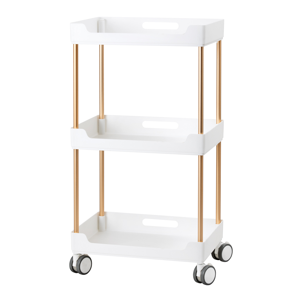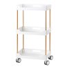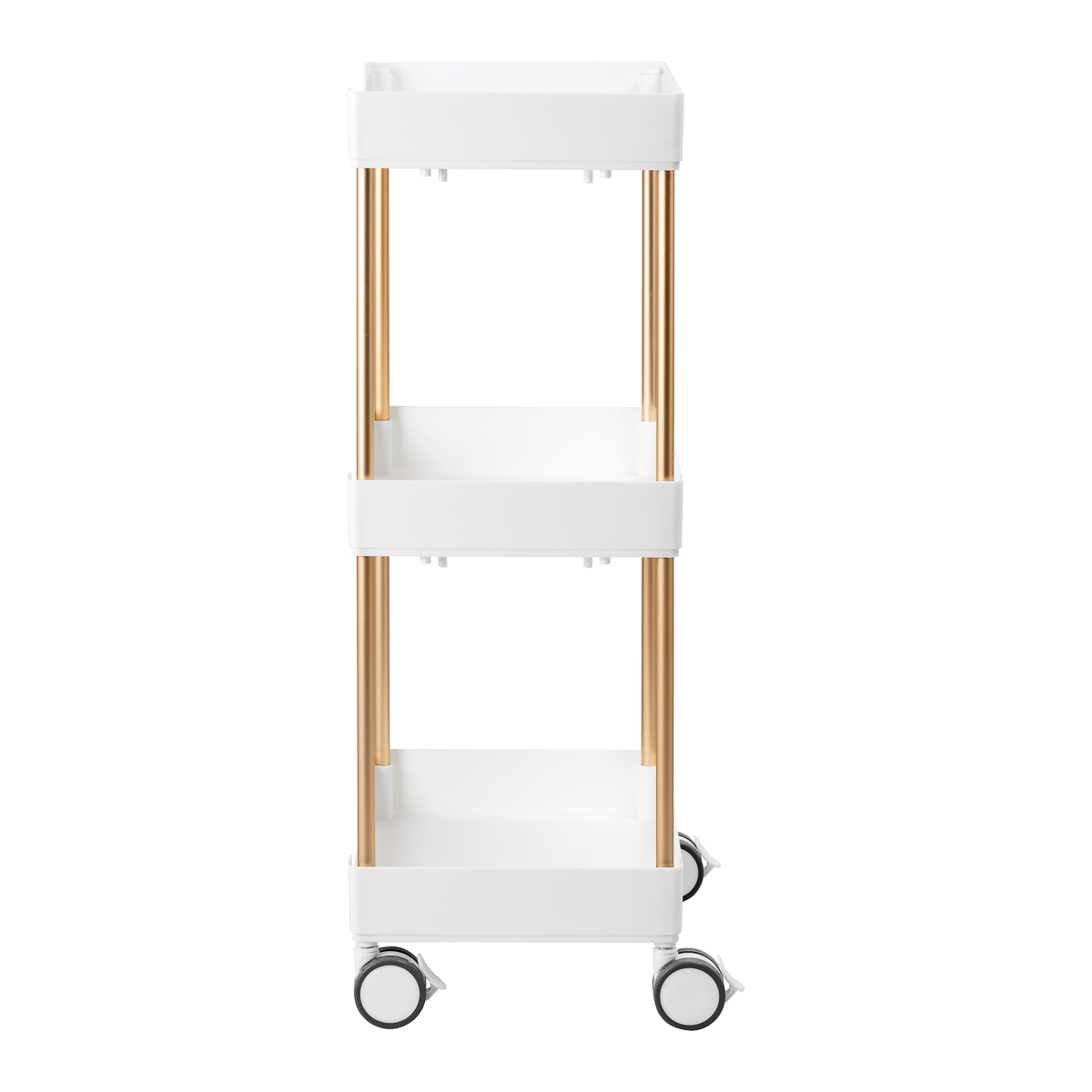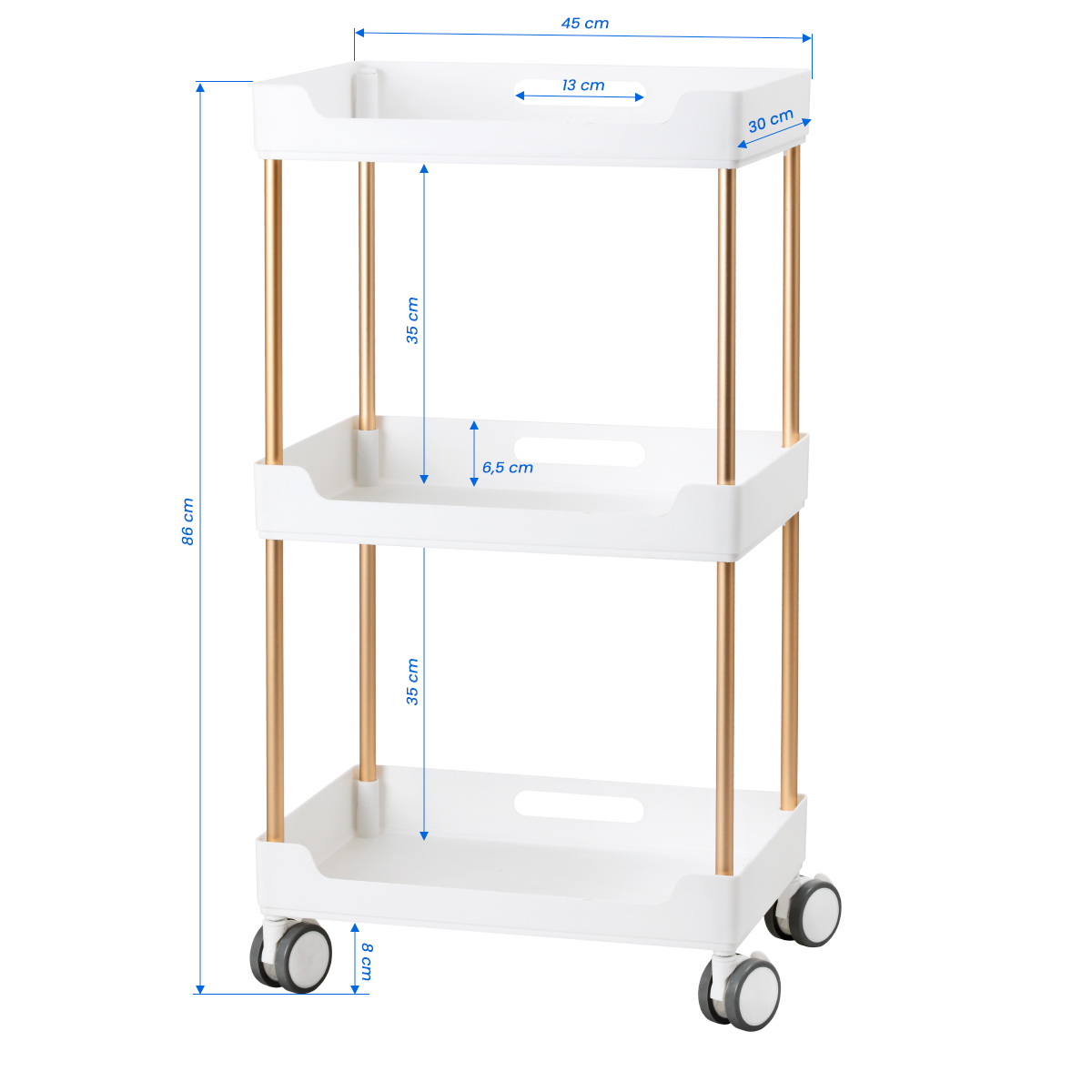 Police su izrađene od plastike u nijansama bijele boje, a povezuje ih konstrukcija od metalnih cijevi u boji bakra, što stvara moderan i estetski skladan izgled koji je jednostavan za održavanje. Ručke na svakoj polici omogućuju lako pomicanje i siguran prihvat. Stolić je opremljen s četiri kotačića s mogućnošću blokade, što omogućuje potpunu mobilnost i fleksibilnu organizaciju prostora. Kvalitetni materijali osiguravaju dugotrajnost i udobnost u svakodnevnom korištenju.