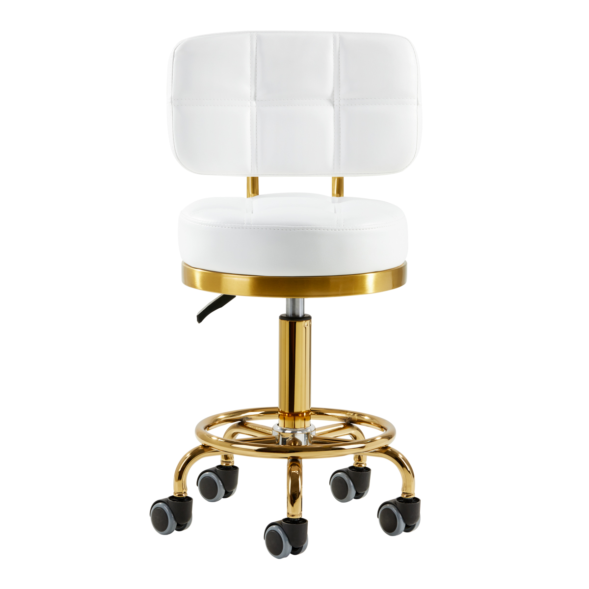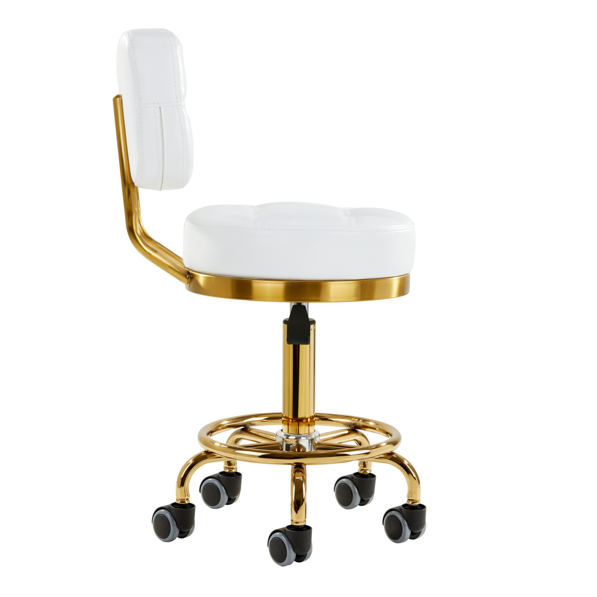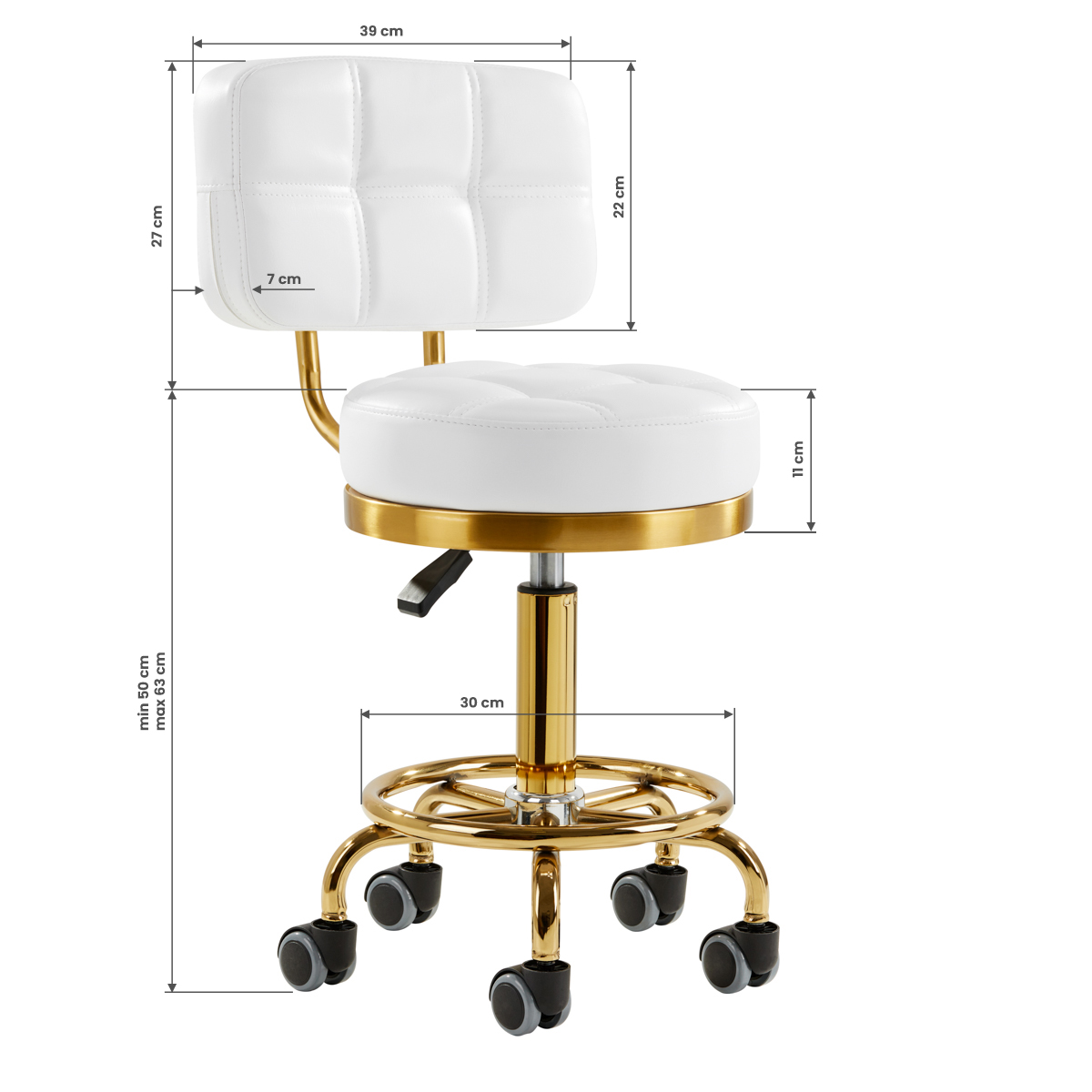 Kozmetička stolica Lux Gold s ergonomskim naslonom namijenjena je za rad u kozmetičkim salonima. Podešavanje visine u rasponu od 50-63 cm pomoću učinkovitog plinskog pokretača omogućuje vam prilagođavanje stolice vašim individualnim potrebama. Baza s pet krakova osigurava stabilnost. Presvlaka izrađena od umjetne kože u bijeloj boji lako se održava čistom.