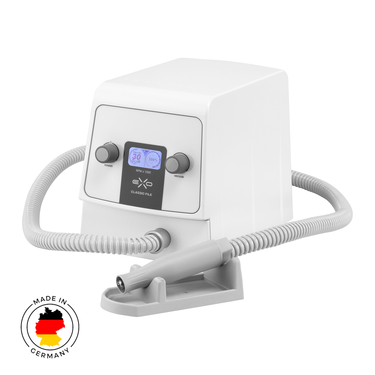 Pedikerska brusilica Exo Classic File s apsorberom namijenjena je uglavnom za suhu pedikuru. Ergonomska ručica s mikromotorom omogućuje podešavanje brzine do 30.000 okretaja u minuti. Sva prašina koja se prikupi tijekom rada usisava se u usisnu turbinu, tj. apsorber. Push-in & Pull-out mehanizam osigurava jednostavnu zamjenu nastavaka, samo gurnite nastavak u utor, bez potrebe za zavrtanjem ili zaključavanjem.