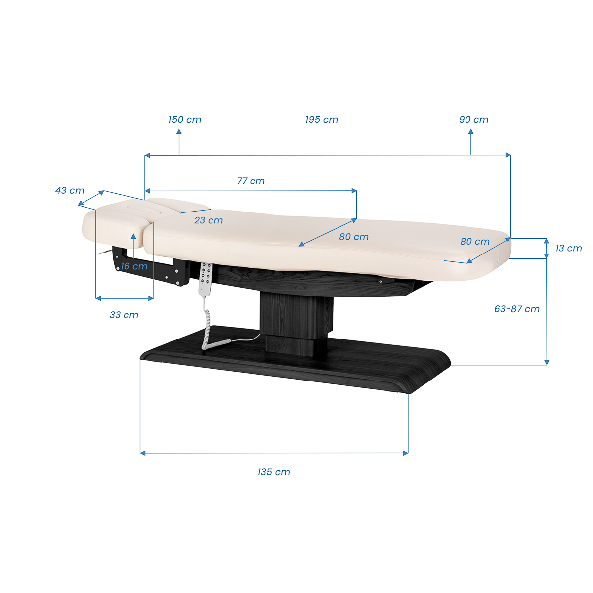 Ležaj je opremljen električnim podešavanjem visine u rasponu od 63–87 cm te podešavanjem kuta nagiba naslona i oslonca za noge, što omogućuje precizno prilagođavanje položaja ovisno o vrsti tretmana. Širok raspon podešavanja olakšava održavanje ergonomskog položaja tijekom rada, bez obzira na visinu terapeuta ili specifičnost postupka.