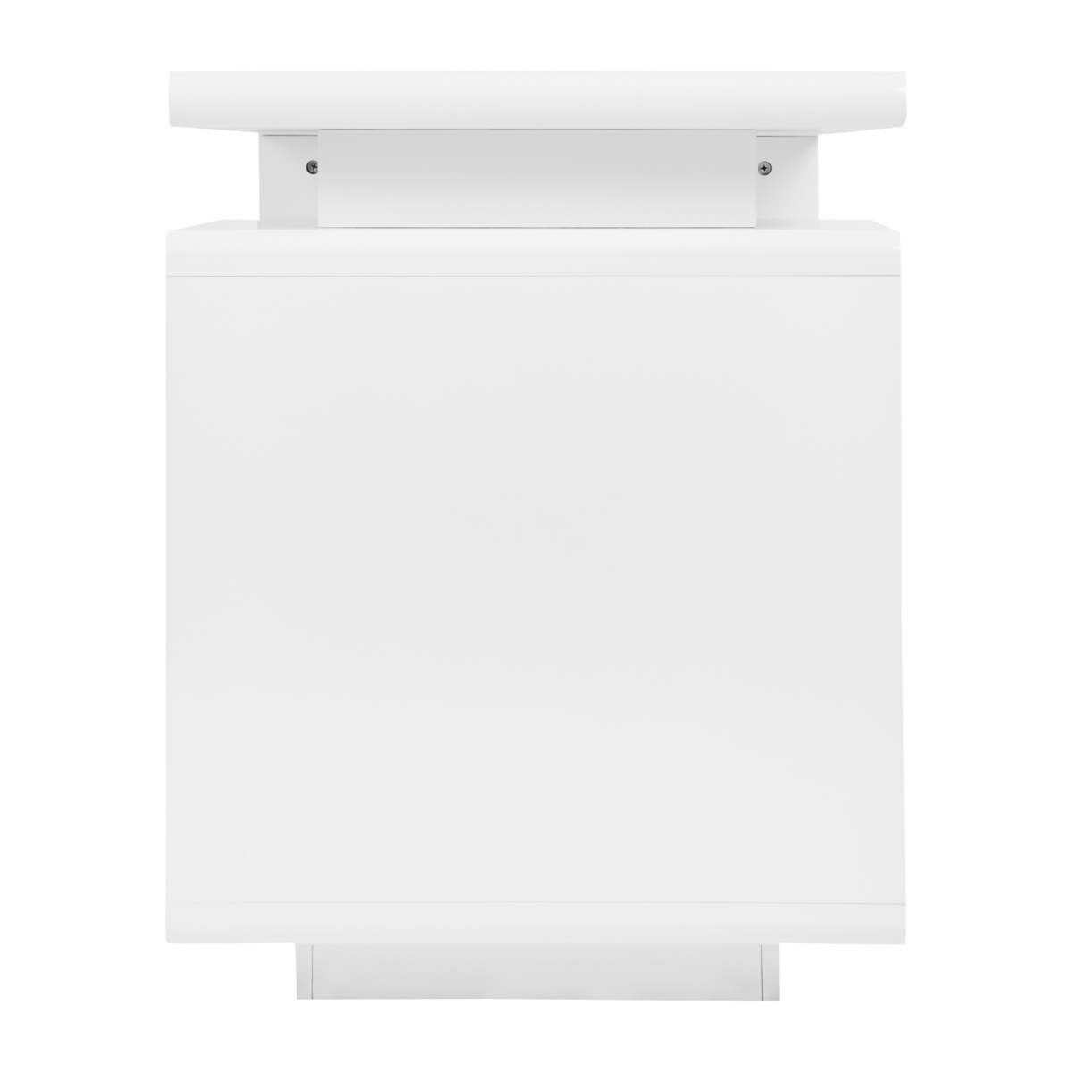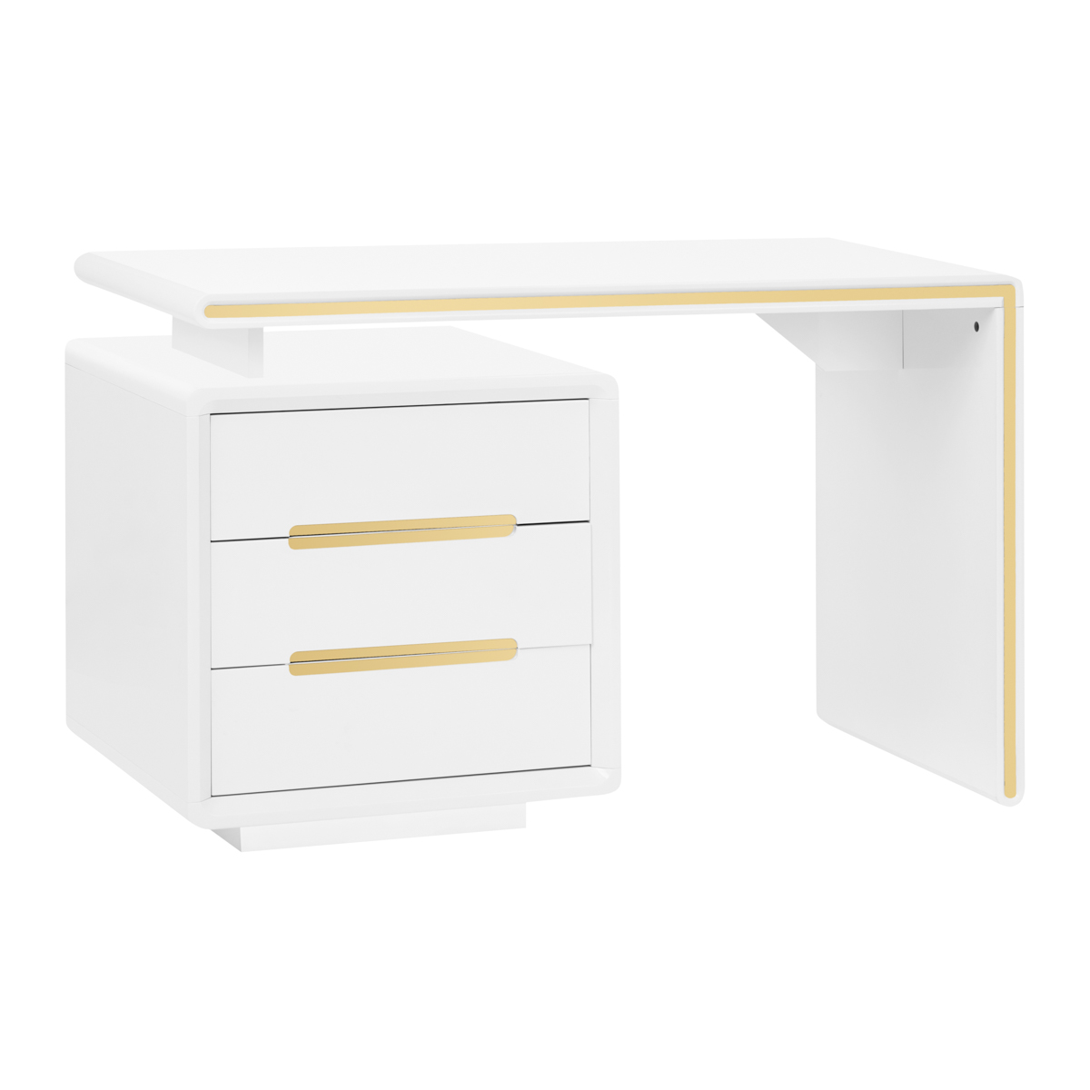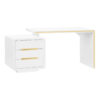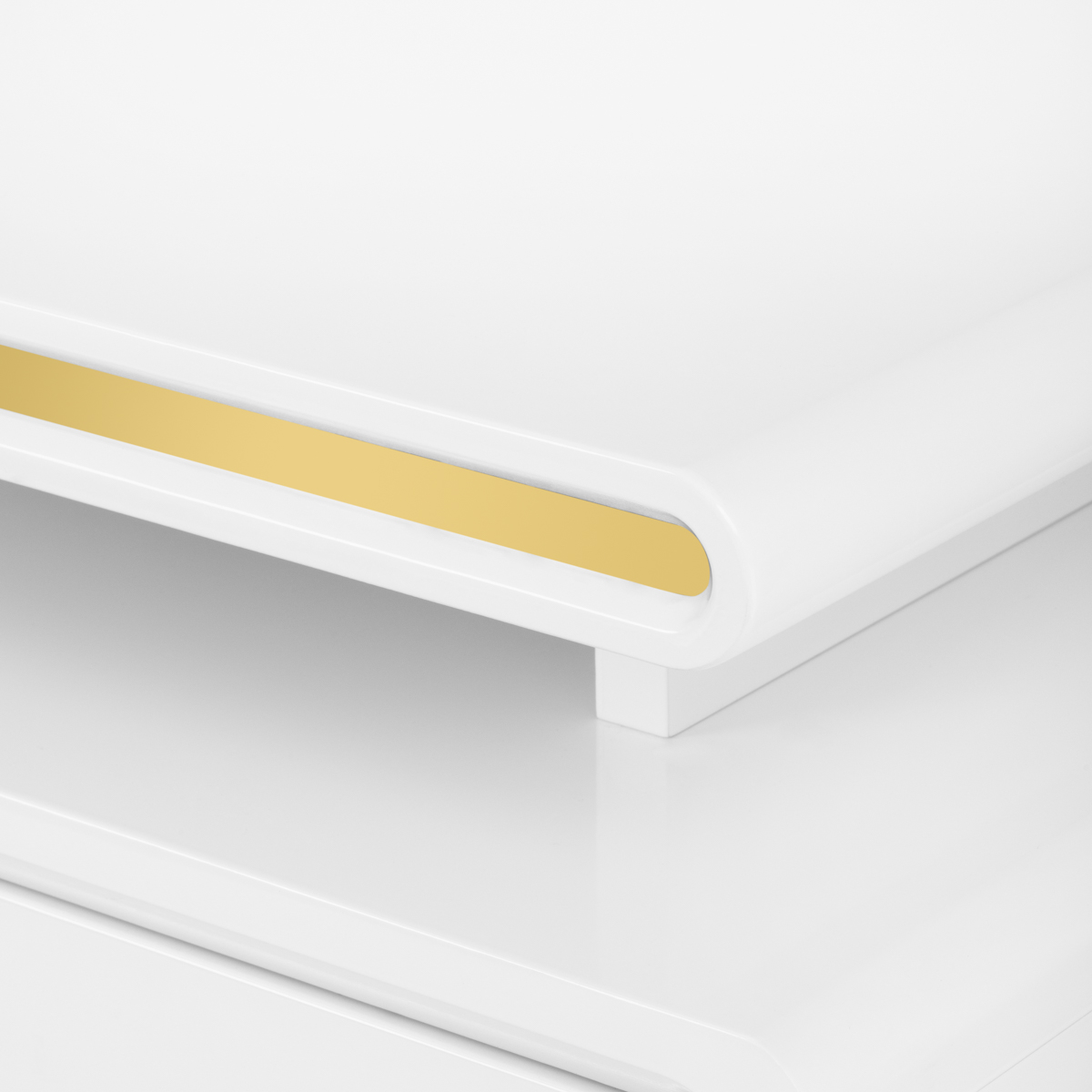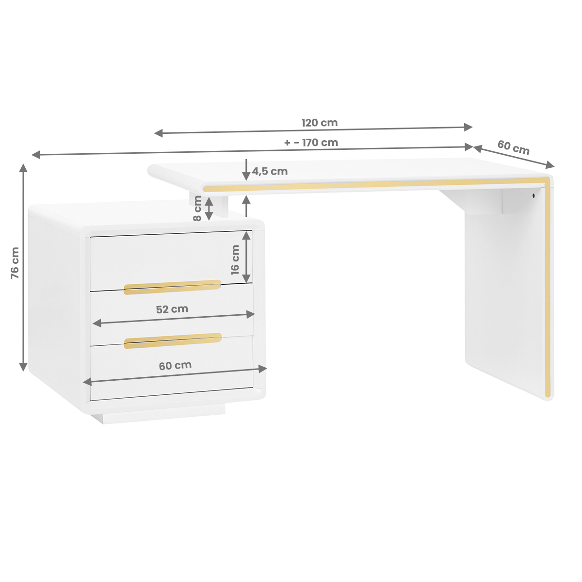 Funkcionalan i praktičan kozmetički stol koji će se uklopiti u svaki ambijent. Pored kozmetičke namjene, stol se može koristiti i kao uredski stol, a njegov dizajn omogućit će pravilnu organizaciju radnog prostora i sve potrebne stvari bit će nadohvat ruke. Stol sadrži ormarić s tri prostrane ladice i glatku, široku ploču na kojoj se sve obavlja vrlo lako. Dodatna prednost ovog modela je mogućnost postavljanja ploče stola i ormarića ovisno o individualnim potrebama i preferencijama. Lakirana površina visokog sjaja u bijeloj boji i ukrasni zlatni elementi daju elegantan izgled. Dimenzije stola su prikazane na fotografiji.