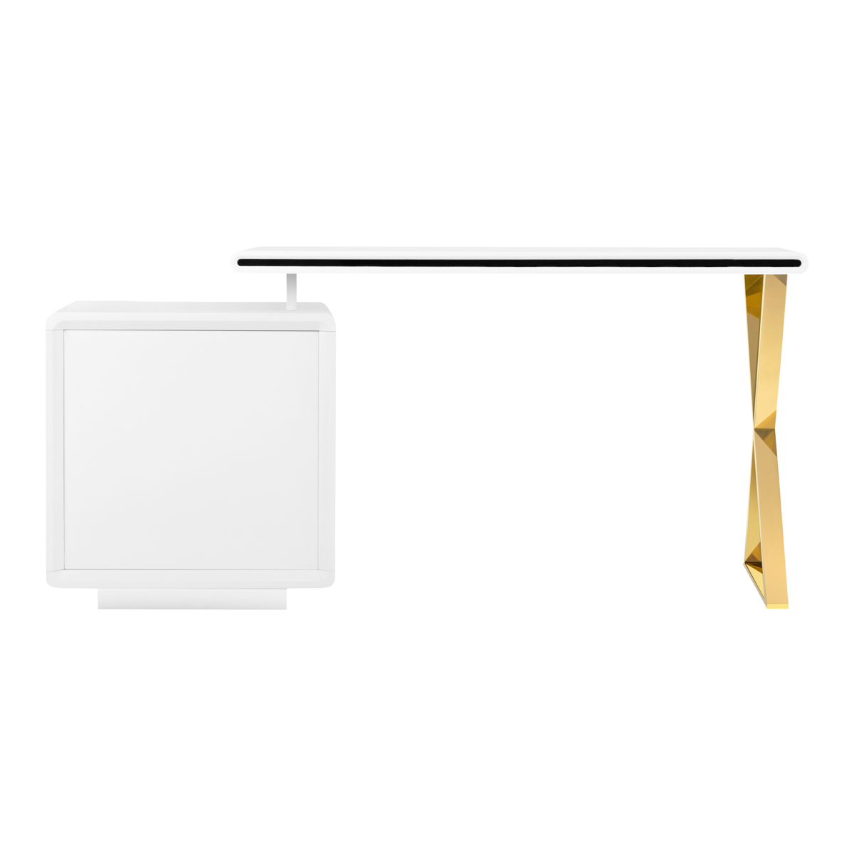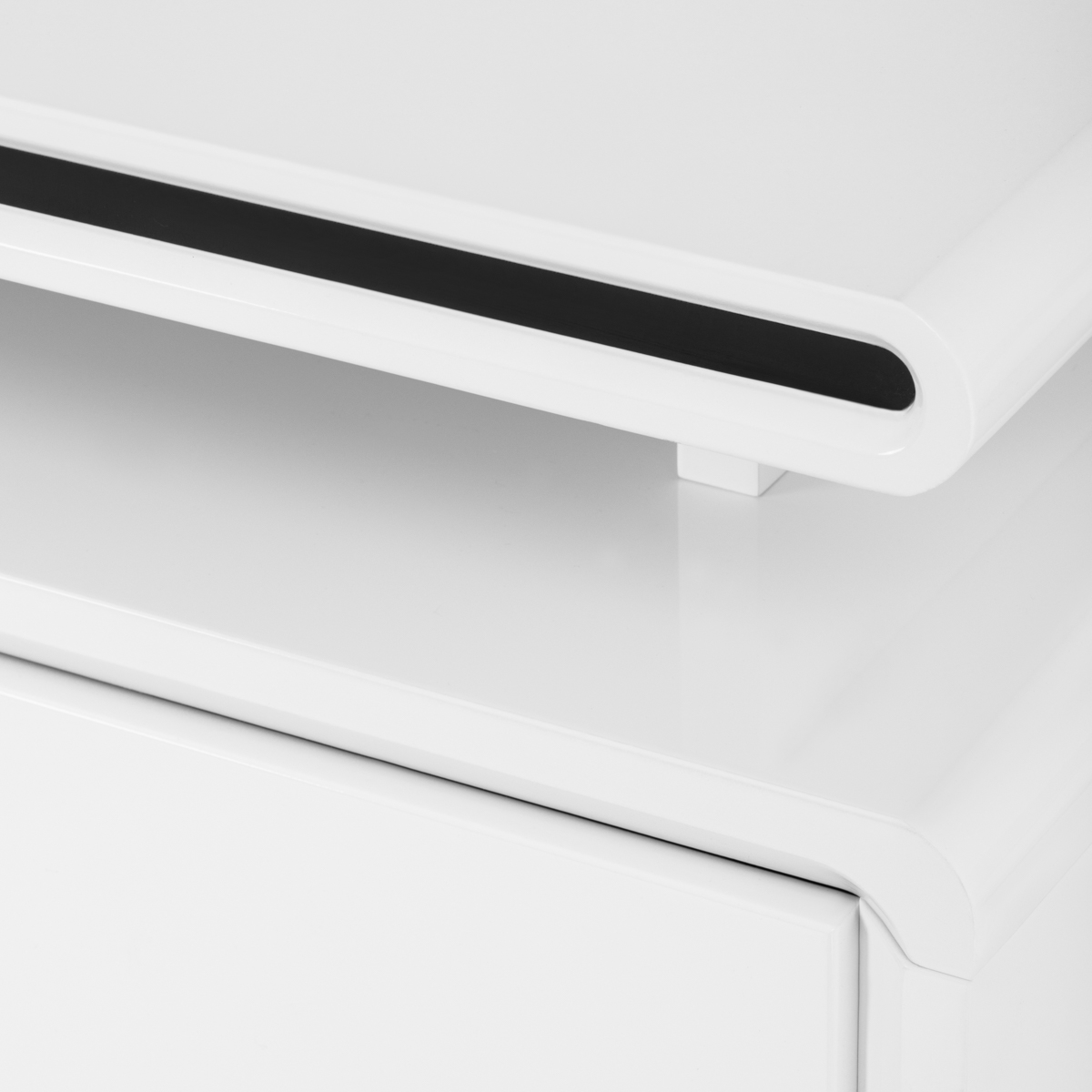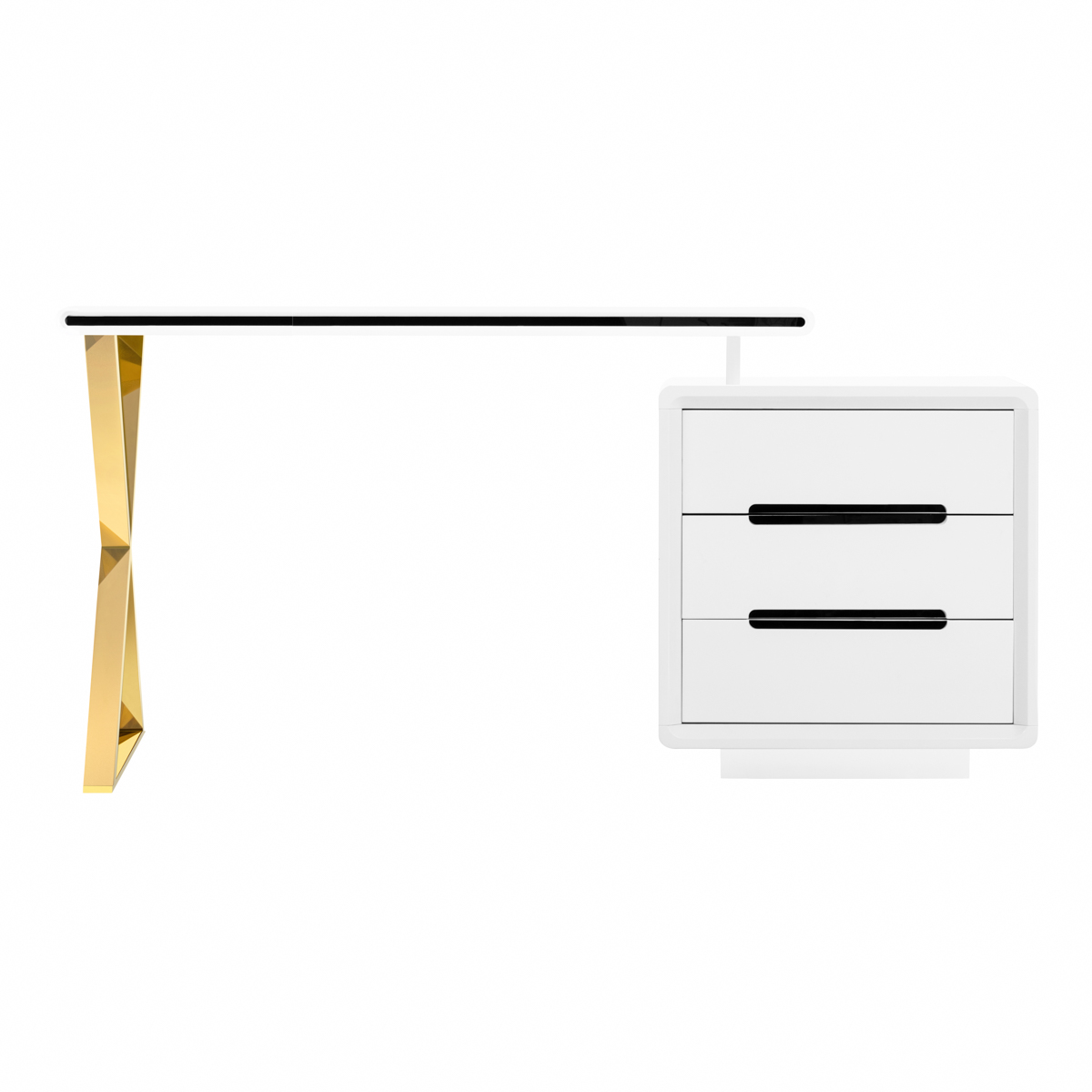 Funkcionalan i praktičan stol koji će se uklopiti u svaki ambijent. Pored kozmetičke namjene, stol se može koristiti i kao uredski stol, a njegov dizajn omogućit će vam da pravilno i transparentno organizirate svoju radnu stanicu i stavite sve potrebne dodatke nadohvat ruke. Ormarić stola se može, ovisno o potrebama, pomicati u pravoj liniji desno/lijevo i unutra/vani, mijenjajući veličinu stola. Izrađen je od medijapana visokog sjaja dok bijela boja i sjajna površina daju cjelini elegantan izgled.
